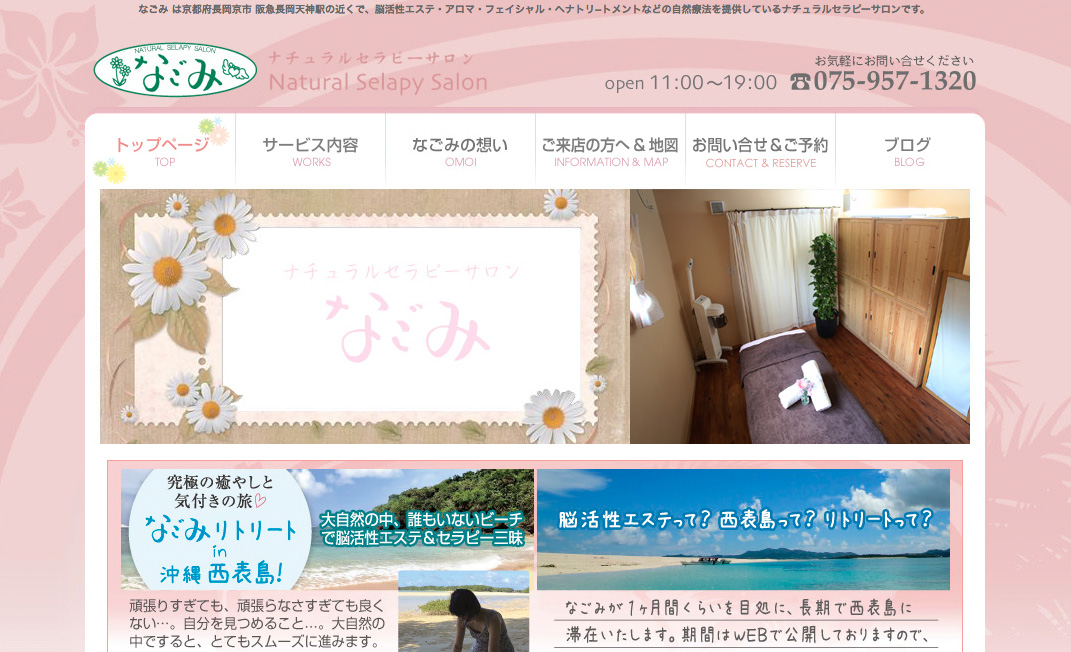 なごみ様は京都府長岡京市の阪急長岡天神駅近くで、脳活性エステ・アロマ・フェイシャル・ヘナトリ−トメントなどの自然療法を提供しているナチュラルセラピーサロンです。