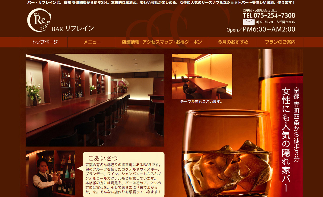 BAR Refrain 様は、京都 寺町四条から徒歩3分。店長さんの作り出す美味しいお酒や、店長さんや女性スタッフの心づかいなどとても居心地が良く、本格的なお酒と、楽しい会話が楽しめる、女性に人気のリーズナブルなショットバーです。