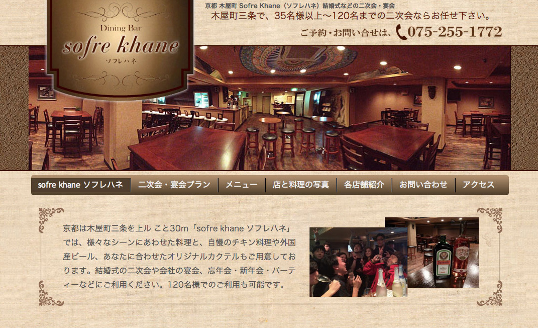 Sofre Khane(ソフレハネ)様は、京都の木屋町 三条 上ルこと30mという好立地で、結婚式の二次会や会社の宴会、忘年会・新年会・学生宴会・パーティーなど、宴会・貸し切りをメインに営業されておられます。着席で120名様までご利用可能と、他にはない規模も魅力ですね。
